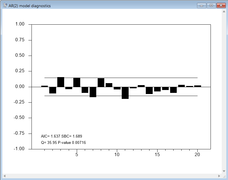 The most interesting summary statistics in the BOXJENK output are the standard error of estimate (for conditional least squares) or the likelihood function (for maximum likelihood) as your measure of fit, and also the \(Q\) statistic. Ideally, you would like the \(Q\) to be statistically insignificant. In addition, it’s standard practice to examine the autocorrelations of the residuals, looking for large individual correlations. The \(Q\) can pick up general problems with remaining serial correlation, but isn’t as powerful at detecting a few larger-than-expected lags. For residuals, it generally makes more sense to do the autocorrelations only (not partials).