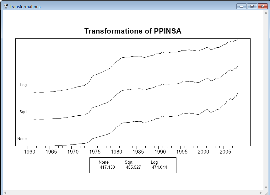 We can’t apply @BJTRANS to the SPREAD series, as it contains non-positive values (so the square root and log transforms won’t work). To demonstrate how this works, we can apply the procedure to a producer price index series that is also included on the QUARTERLY.XLS file: