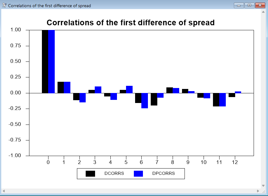 Recall the fairly complicated DIFF, CORR and GRAPH instructions that we used earlier to produce graphs of the correlations for both SPREAD and the first difference of SPREAD. Using @BJIDENT, the following is all you need to produce even fancier versions of these graphs: