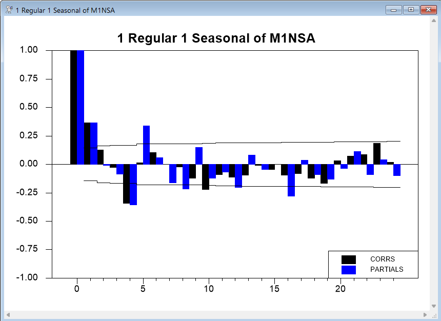 Some textbooks recommend an “automatic” model selection procedure which examines all the ARIMA models with a small number of AR and MA parameters (say, all combinations of between 0 and 4 with each), and chooses the model based upon one of the information criteria, like the Akaike or Schwarz criterion. (The procedure @BJAUTOFIT, described later in this section, can be used to do this). For many series, this works fine. However, it’s hard to entertain models with lag skips using this type of search. For instance, the search just described would require checking 25 models, but if we allow for any set of lags for each polynomial, such as lags 1 on AR and 1 and 4 on the MA, we’re up to 1024 possible candidates, 32 combinations for each polynomial. For a series with seasonality, it’s very likely that the “best” model will have this type of lag structure. So understanding how to choose and adjust a model is still likely to be important in practice.
