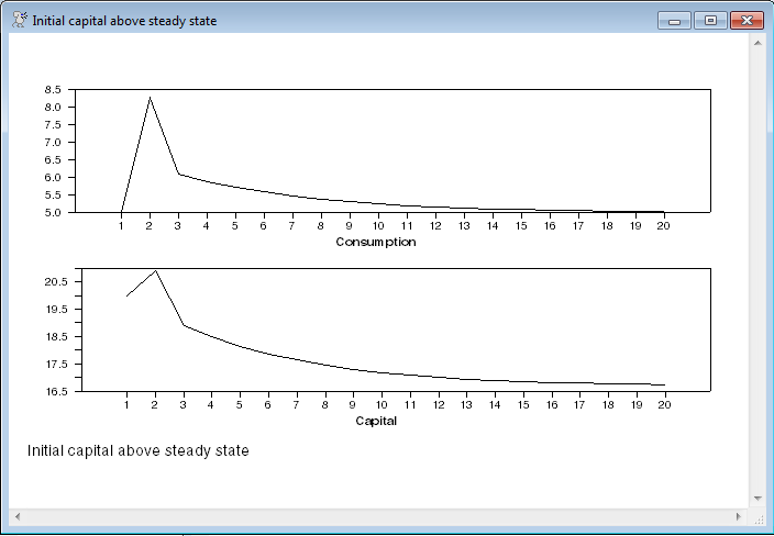 The program then does three "experiments" to see the dynamic behavior if the initial conditions are different from the steady-state. These are done with DLM using the X0 (which gives the initial state) and PRESAMPLE=X1 (which says that the initial state is actually for t=1, not t=0) options. This first one has consumption (state 1) set at 3, which is below the steady state of 5 (and capital is above its steady state). This creates the first graph below, where consumption jumps above the steady state straight off and then declines from there. The other experiments are done similarly.