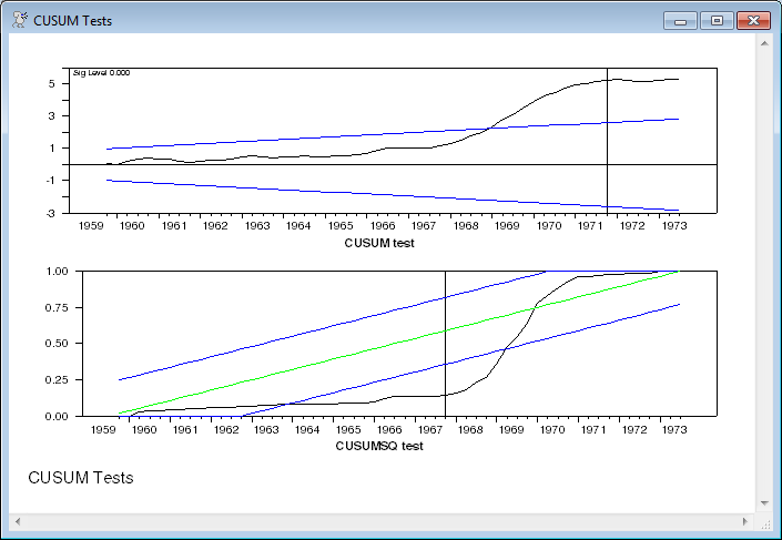 Next is a graph of the recursive residuals with the (recursively estimated) standard error bands. This doesn’t form a formal test; however, if there is a break, it’s likely that the residuals will, for a time, lie outside the bands until the coefficients or variance estimates adjust. (Graph).