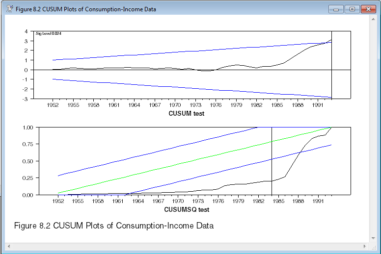 The top graph is the CUSUM test, which tests primarily for a break in the model itself, and the CUSUMSQ test which tests primarily for a break in the residual variance. The vertical lines mark the largest deviation. The expected value for the CUSUM is zero, while for CUSUMSQ, it's the green line. In both cases, the blue lines show the .05 limits for deviations. The CUSUM test seems to indicate a possible problem right near the end of the data, while the CUSUMSQ test rather strongly rejects model stability.