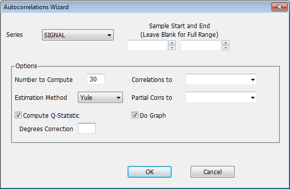 You can use the Autocorrelations Wizard on the Time Series Menu to generate autocorrelations and partial autocorrelations for a series. The Wizard generates a CORRELATE instruction. Selecting the Wizard brings up the following dialog box: