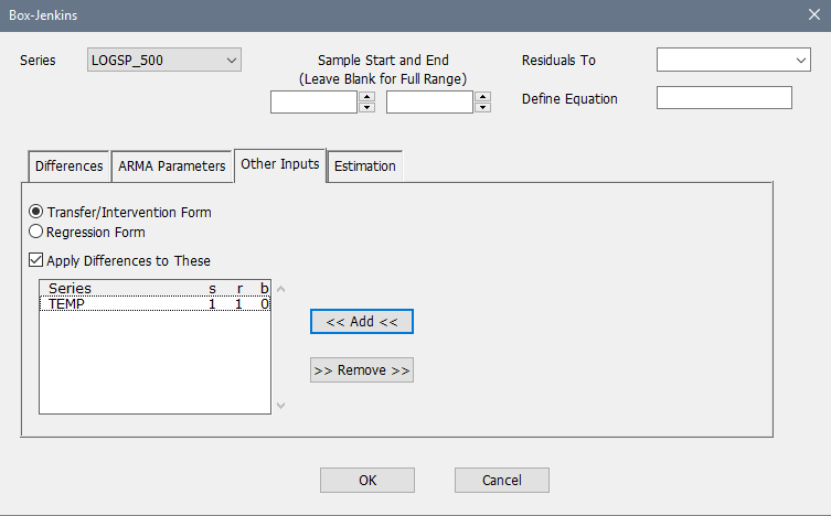 The Other Inputs tab is for any other regression or shift effects other than the ARMA parameters and constants. Note that any such variables have to be created earlier. These come in two forms: the Transfer/Intervention Form is the original method from the Box-Jenkins literature which adds terms which have a structure similar to the ARMA model itself—lags and dynamics are handled through the numerator, denominator and delay parameters. The Regression Form creates a mean model which takes the standard form for a linear regression with any lags and dynamics handled by including specific lags in the list of regressors. An example with the Other Inputs tab exposed (with the Regression Form button selected) is