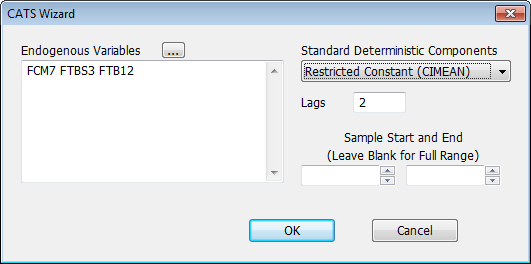 Selecting the CATS Cointegration Wizard from the Time Series Menu brings up the following dialog box, which allows you to set some of the basic parameters for the CATS model. When you click OK, RATS will source in the CATS procedures and start CATS using the settings you requested. You will see some initial output in the output window, and the various CATS menus will be added to the RATS menu bar. See the CATS manual for more information on using CATS. (The wizard dialog is deceptively simple since most of the interesting work is done using the menus and dialogs that CATS itself brings up).