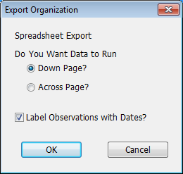 This dialog controls the arrangement of the data when you export a set of series from a Series List Window in one of the "spreadsheet" formats. You can choose to have the data series run down the page (organized by columns) or across the page (organized by rows). You can also choose whether or not to label the observations with dates.