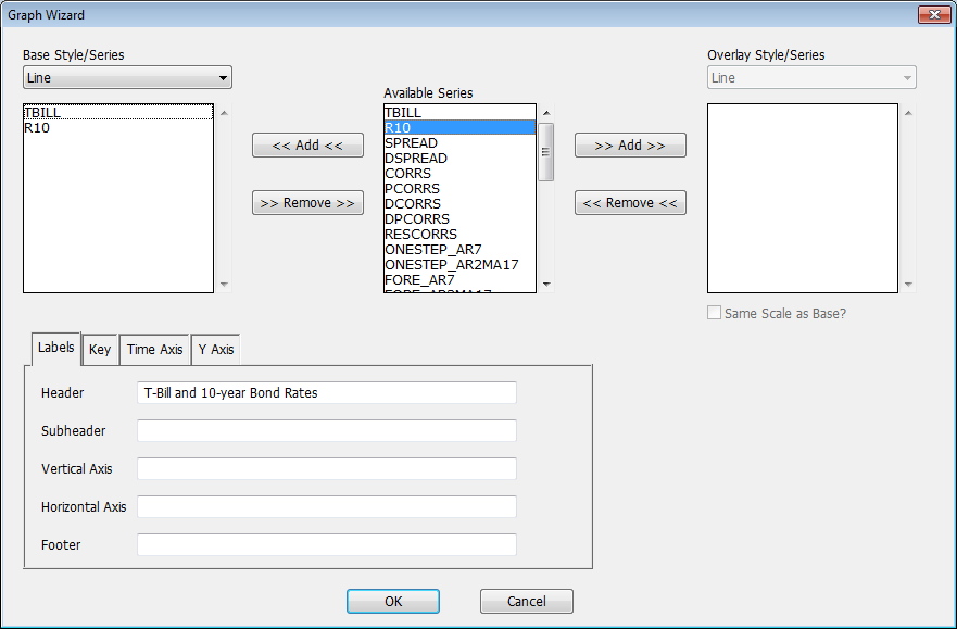 The Available Series list in the middle of the dialog box shows all the series. To graph one or more series, select (highlight) the series from the Available Series list, and click on the Add button on the left of the list. This adds those series to the Base Series list.