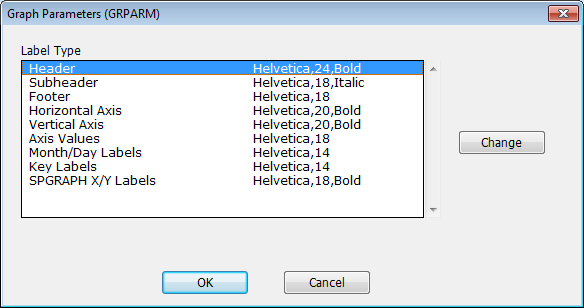 To change the settings for a particular label, either double-click on the label name, or select the name and click on Change. This will bring up a standard front selection dialog box that you can use to set the label attributes. Once you have made the desired changes, click on OK to generate a GRPARM instruction that implements those changes.