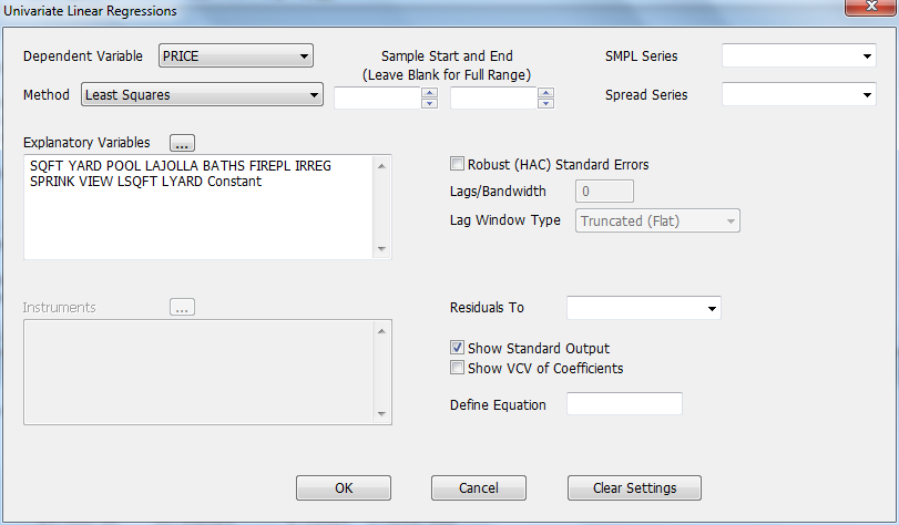 Use these fields to select the explanatory variables and (where applicable) the instrumental variables. You can either type in a list of explanatory variables in Regression Format, separating variables with at least one blank space, or click on the series list button