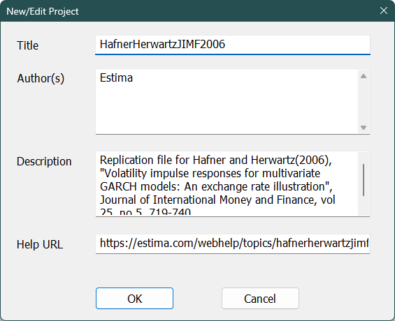 The Title is required and will be the name displayed in the title for the Project Window. The Author(s), Description and Help URL fields are all optional. If you include the Help URL, that will pop up in the browser if the user presses the
