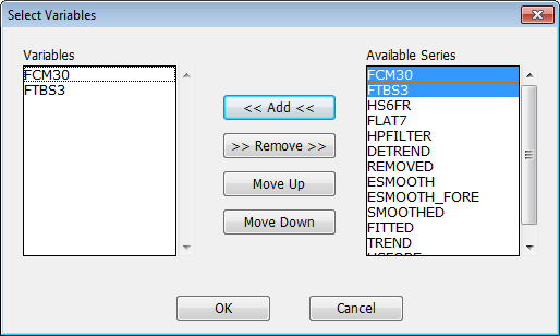 The left (Variables) is the target list that you're constructing. To add series to it, double-click on the name of a series in the Available Series column, or select (highlight) one or more variables and and click on the Add button (use <Shift>+Click to select a range of variables, <Ctrl>+Click to select an additional variable).