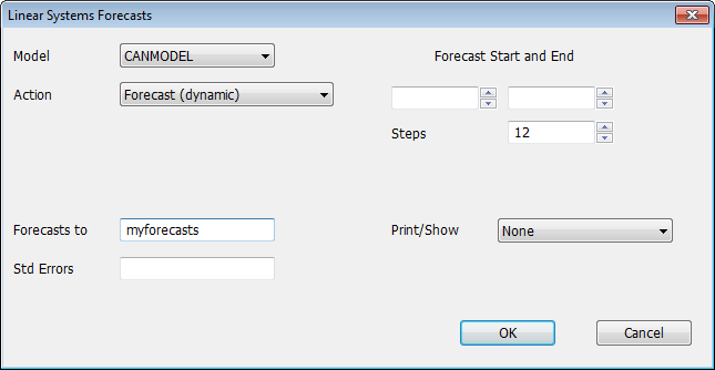 For the forecasting, simulation, and historical decomposition choices: If you only specify a value for Steps, computations will begin with the first period after the end of the most recent estimation range. If you prefer, you can use the Start field to specify a different starting period (leaving the End field blank and using Steps to control then number of periods computed).