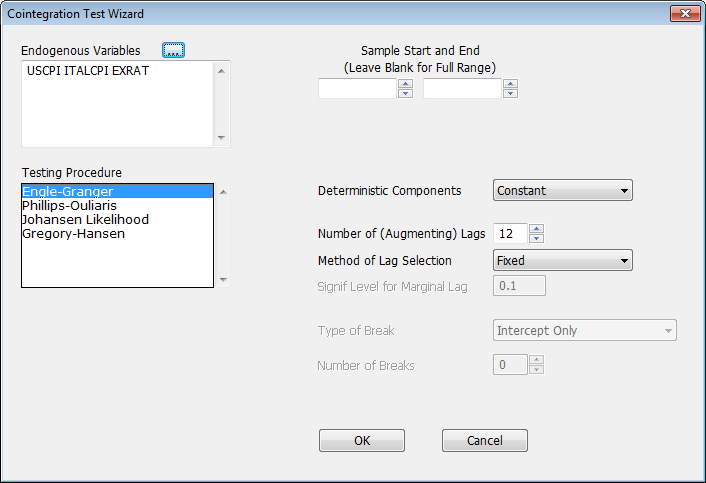 This Wizard provides dialog-driven access to several cointegration testing procedures: Engle-Granger (@EGTEST), Phillips-Ouliaris (@POTEST), Johansen likelihood (@JOHMLE) and Gregory-Hansen (@GREGORYHANSEN). The last allows for breaks in the relationship.