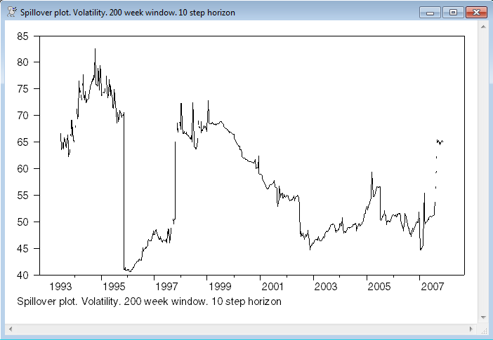 In addition to the full sample tables, the papers include graphs of "rolling sample" estimates of the spillover measures. These involve moving sample estimates of the VAR's. For the 2009 paper, the window has 200 elements, which is roughly four years of weekly data. The graphed quantities are replaced with the missing value for those observations, which results in gaps (with sparse dots) in the graph. See, for instance, the middle of 2007 in the graph below.