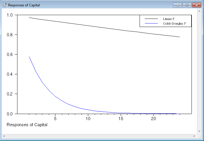 graph(footer="Responses of Capital",key=upright,klabels=||"Linear F","Cobb-Douglas F"||) 2