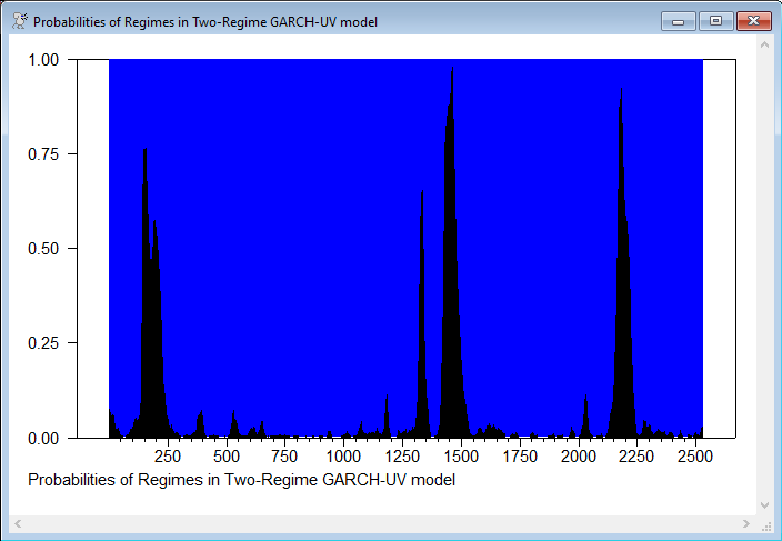 This is the graph of smoothed probabilities of the regimes from the dueker_swgarch_uv.rpf program. Black is the probability of regime 1 (which is the low mean/high variance regime).