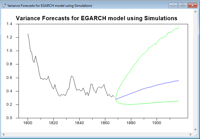 EGARCHSIMULATE.RPF is an example of simulating an EGARCH model for forecasting variance out-of-sample and/or producing a random sample from it. A companion (and almost identical) program EGARCHBOOTSTRAP.RPF does the same type of analysis, but with random simulations rather than bootstrapping.