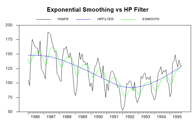 GRAPH(STYLE=LINE,HEADER="Exponential Smoothing vs HP Filter",KEY=ABOVE,NOKBOX) 3