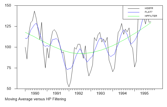 GRAPH(STYLE=LINE,FOOTER="Moving Average versus HP Filtering",KEY=UPRIGHT) 3