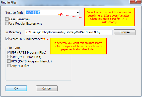 Enter the text into the Text to Find box. This would find uses of the MV=BEKK option for a GARCH model. You want to be careful about the choice of search string so you don't get too many "hits". For instance, BEKK by itself would likely match many comments. The Case Sensitive and Use Regular Expressions checkboxes apply to the search. It's usually not a good idea to do a Case Sensitive search since the RATS language isn't case-sensitive. If you understand them, Regular Expressions can be very handy in restricting the search.