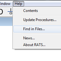 "Find in Files" is a feature for helping you locate RATS programs or examples which have specific instructions or phrases in them. (For instance, to locate examples of GARCH models). To use it, choose the menu operation Help>Find in Files: