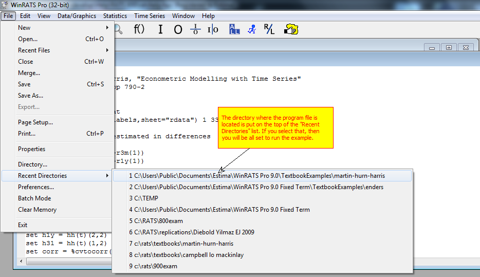 If you would like to run an example that you've found this way, its data file is probably in the same directory as the example. To make it easier to find that, the directory where the chosen example is located is put at the top of the Recent Directories list. Choose the File>Recent Directories operation and take the top line from the list.