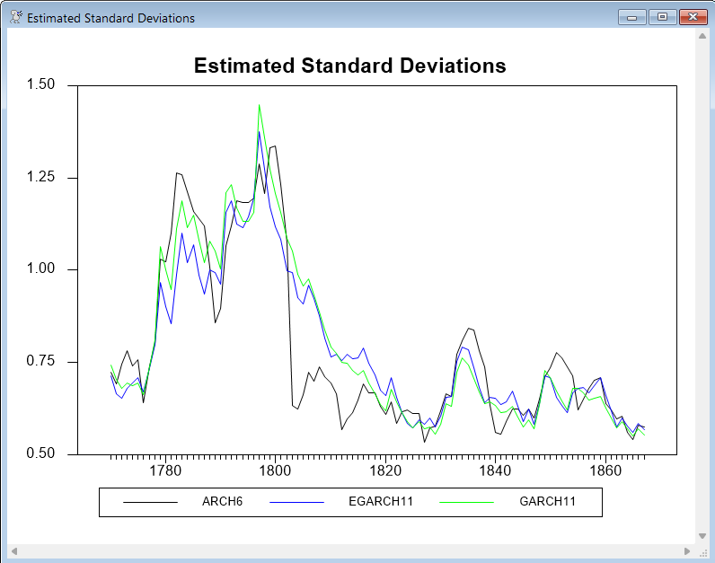 GARCHUV.RPF computes and graphs standard deviations from three models over roughly 100 data points. The HSERIES option is used in each model to save the variances (into separately named series), and those are transformed to standard deviations for the graph.