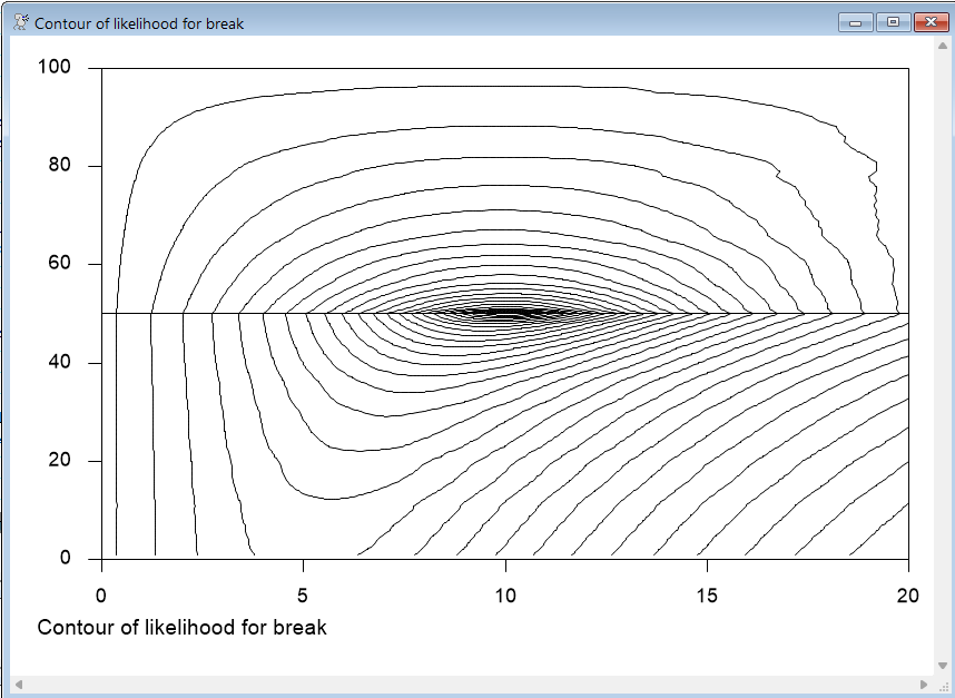 gcontour(footer="Contour of likelihood for break",x=mus,y=breaks,f=f,vgrid=||50||)