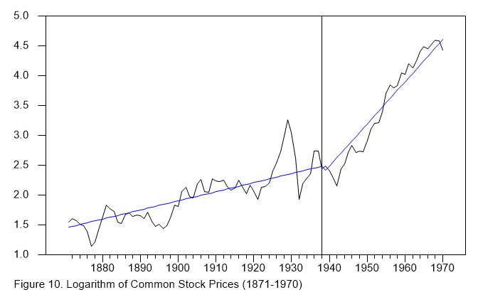 graph(footer="Figure 10. Logarithm of Common Stock Prices (1871-1970)",grid=(t==1938:1)) 2