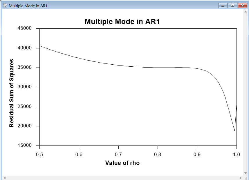 This examines the estimation of a regression with autocorrelated errors, doing a full grid search over values of \(\rho\) for values from .5 to 1.0. It turns out that there are two local modes, one (barely perceptible) at around .81 and one rather obvious at around .99. Depending upon the method used for estimating the model, you could end up with either.