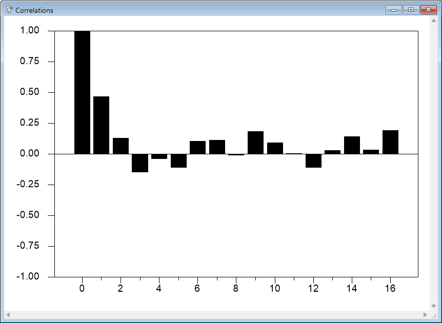 This shows a very basic graph of correlations. If you use any RATS procedures which compute and graph autocorrelations (such as the @BJIDENT procedure), you are likely to run into some graphs that supply additional information. For instance, it’s possible to highlight the correlations which are statistically significant using the SHADING option.