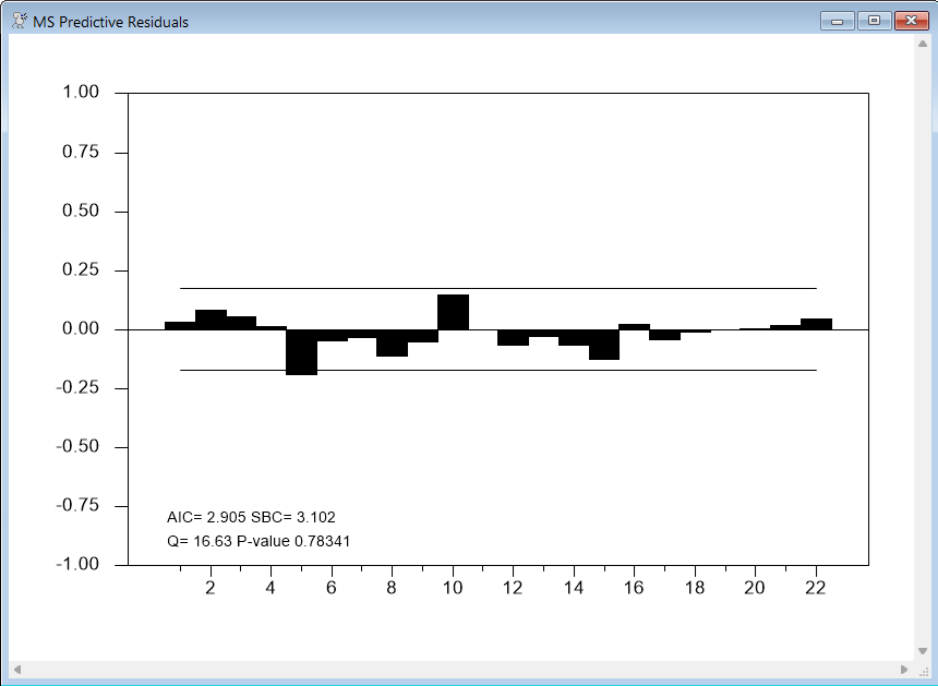 Predictive probability-weighted standardized residuals is quite a long description, but they are the proper choice for doing any diagnostics. The regime-specific residuals (the model residuals across time for a specific regime) won’t work because the model says nothing about their behavior in the time periods which aren’t part of that regime. The residuals have to be computed using the model’s predictions, weighted by the predictive probabilities for them to be serially uncorrelated. They are standardized because if the variance is switching (it isn't in this example), the regimes would be predicting different variances, so the residuals have to be standardized before being probability-weighted. If the model is correct the residuals would be expected to be serially uncorrelated. They would not, however, be expected to be Normal.