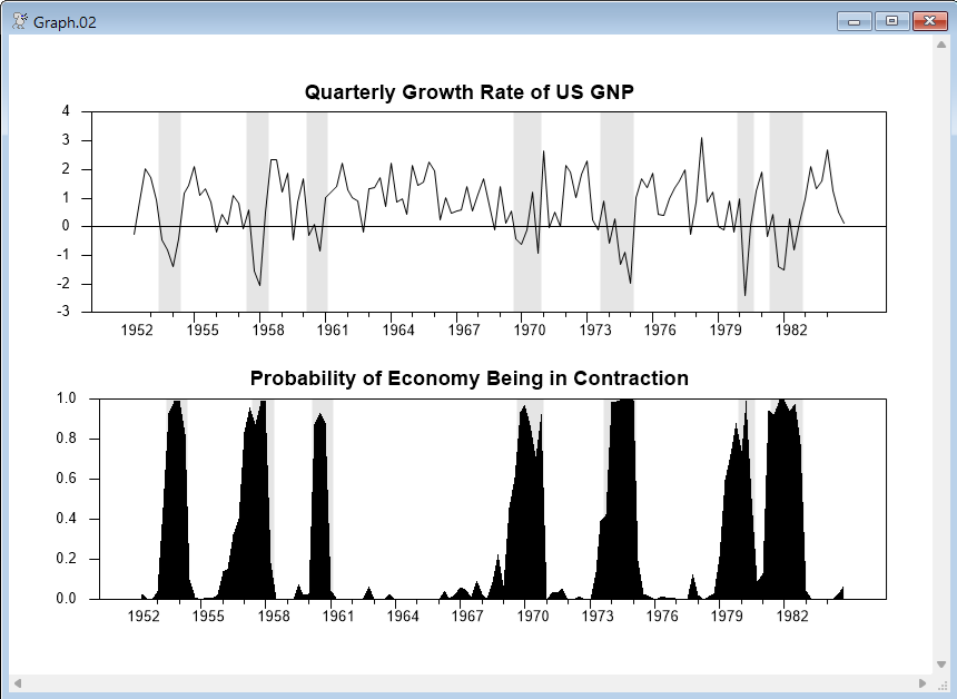 This computes the smoothed estimates of the states, and puts into PCONTRACT the probability of the lower mean regime (the first, if our guess values held up).