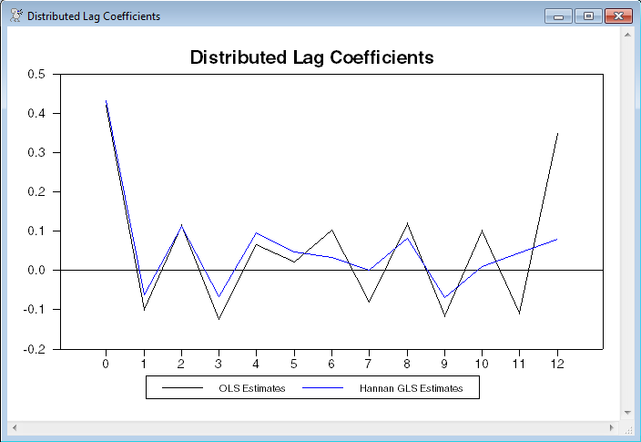 To implement Hannan’s Efficient estimator, we need to compute the reciprocal square root of the spectral density of the residuals, and do a frequency domain filter of the dependent and independent variables. The actual regression is still done in the time domain. Because the number of variables which must be filtered depends upon the regression, this is not as readily converted into a standardized procedure as the frequency domain techniques. It's simpler here because this is being applied to a distributed lag, where the explanatory variables are all lags of a single variable.