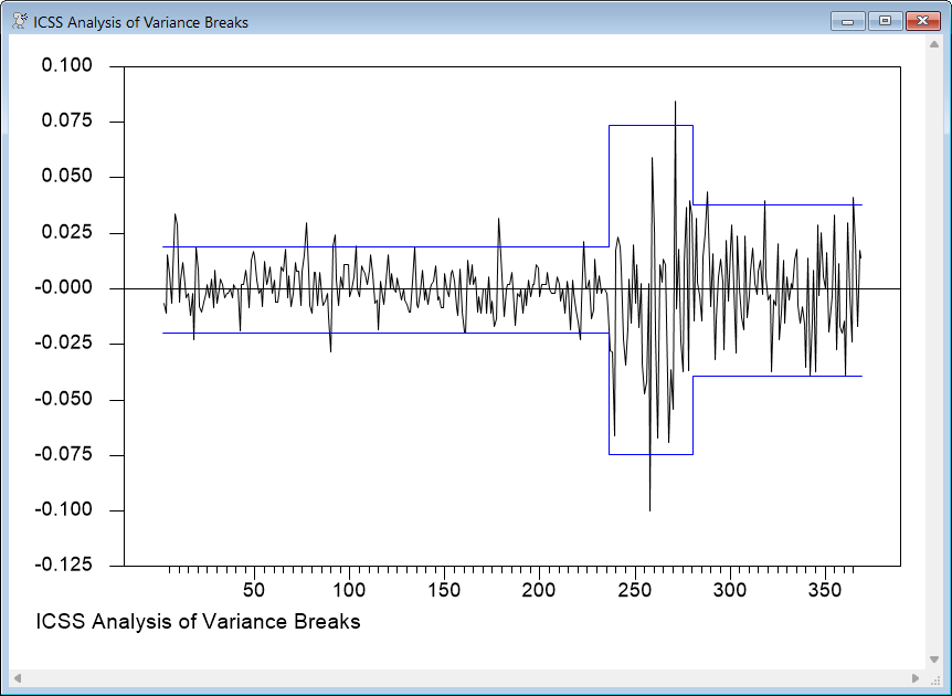 INCLANTIAO.RPF is a replication for an example from Inclan and Tiao(1994). Most of the work is done by the @ICSS procedure. The Inclan-Tiao algorithm searches for structural breaks in variance. Note that these are exogenous changes in variance (that is, the model itself does not explain why the variances are different, just identifies possible change points), unlike a GARCH model where the variance changes endogenously with the data. However, if a GARCH model is correct, you are likely to find "breaks" using @ICSS or if exogenous breaks are correct, you will probably find "GARCH" behavior if you look for it.
