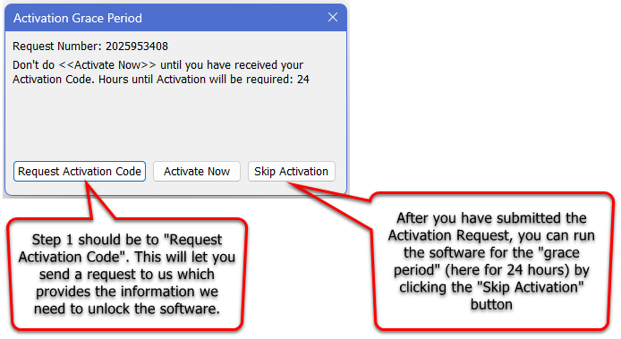 The information at the top tells you how many hours you have left in your grace period. The clock on this starts the first time you actually run the software (not when you install it). The first time you run the software, you should click on the "Request Activation Code" button. That will put up the Activation Dialog. Once you have sent the activation request, you can do "Skip Activation" to run the software during your grace period. Once you have received the e-mail with the Activation Code, you can do "Activate Now" which will also put up the Activation Dialog.