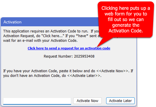 The first time through, you need to click on the highlighted link. This will pop up a web form which will send us an e-mail with the information that we will use to generate the Activation Code. That has the computer's request code and identification of the software product already filled in—you need to add the contact information and then "Submit Request" at the end of the form. (Don't forget to do that).