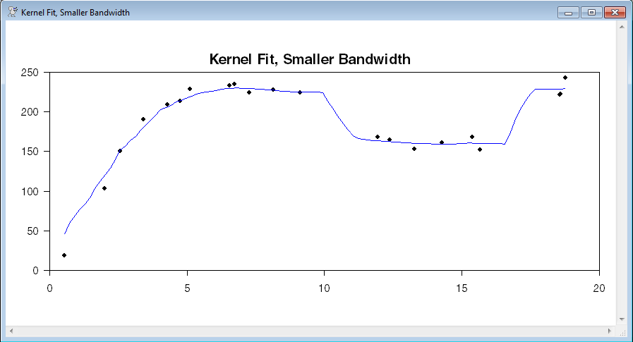 scatter(style=dots,overlay=line,ovsame,header="Kernel Fit, Smaller Bandwidth") 2