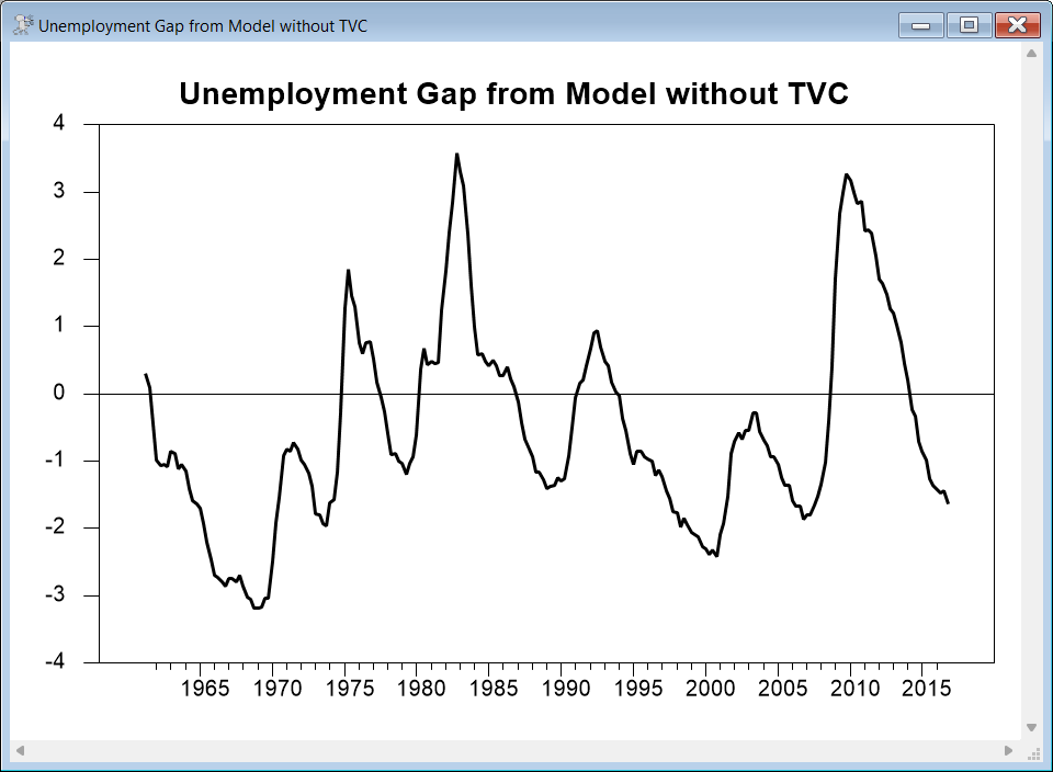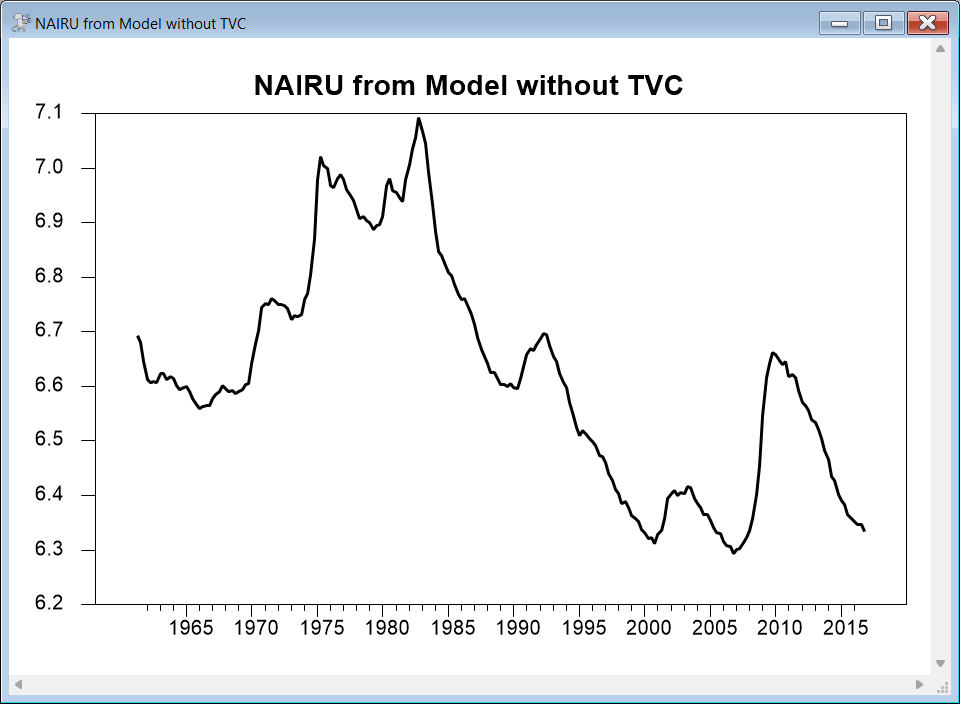 The estimates for the model as described would best be characterized as disappointing. The unconstrained estimate of SWUSTAR (the variance of the random walk process for USTAR) comes in negative. If that gets pegged to zero (as the closest permitted value), then the NAIRU is flat across the entire sample. Note that this is not uncommon in "gap" models like this. The time series properties for USTAR and UGAP are not substantially different. (Unit root vs an AR with a .9 root). So the only thing in the model that distinguishes the two is the presence of UGAP in the Phillips curve. Unfortunately, the likelihood of that is fairly flat over quite a wide range of possible estimates for UGAP, thus doesn't provide much help. In order to give the model content, it is necessary to do something else to distinguish the two components. In this case, we peg the ratio of the shock variances to 15 (with UGAP having the higher variance). This is one of the options used in the work done in the paper itself (which had the same issue). The number is chosen to make the model results look reasonable.