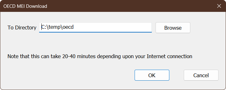 The OECD Main Economics Indicators is a database of major macroeconomic series for roughly 50 countries. This operation (on the Data/Graphics menu) downloads the current release of all the data for all countries. It creates (in the chosen directory), separate RATS format files for the individual countries named for instance USAOECD.RAT, FINOECD.RAT, where the three letter prefix is usually the country's ISO code. There are also two files named AGGOECD.RAT for "aggregate" data, such as totals for G20 countries, and ALLCOUNTRIES.RAT which has all the data across countries.