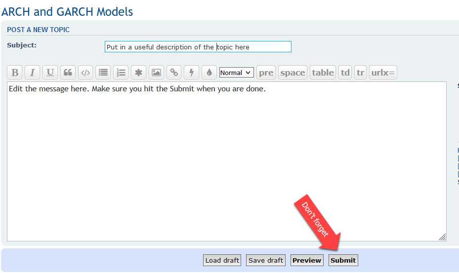 First, pick the most appropriate "Forum" (the items inside the large blue boxes on the main forum screen). For a new topic, this should generally one of the forums inside "General RATS Discussions" or "Econometrics Issues". Click on the forum (say "ARCH and