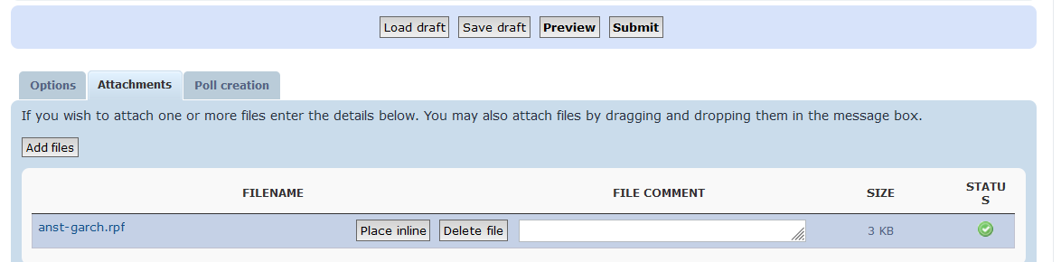 The Attachments tab is at the bottom of the edit window. Attachments are classified based upon the file type (the characters after the final .). The forum accepts any of the RATS file types, any of the accepted data file types, plus some of the standard document types like PDF. (Though if you want to attach a PDF which can be found on a public web site, it would be better to use the URL feature instead). Click on the Attachments tab at the bottom, and then the "Add files" button. You can add a comment to each file (which would be appreciated if their meaning isn't obvious). Note that once these are showing at the tab at the bottom, you can just go back to the edit window.