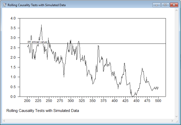 This does the rolling tests with a estimation span of 100 entries. The loop index TIME chooses the end of the window. The test statistic generated by the window ending at entry TIME is saved into the series CAUSETESTS at that entry.