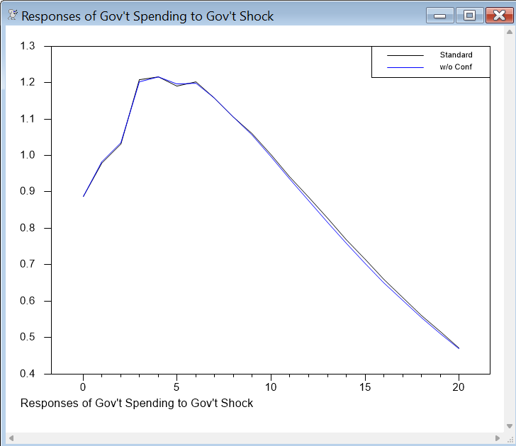 We can now compare graphically the responses to shocks in G using the standard Cholesky shocks (the "1" column in the IRF matrix) with those with the confidence effect shut down (the 1 and only column in the IRF_NOC matrix).