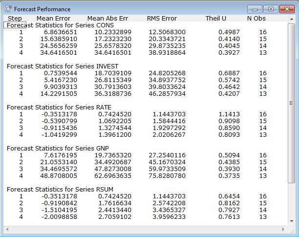 SIMULTHEIL.RPF provides an example of forecast evaluation using a simultaneous equations model.
