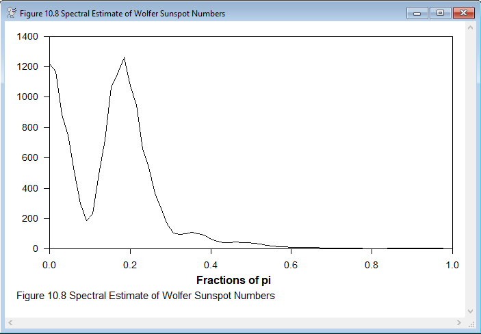 @spectrum(footer="Figure 10.8 Spectral Estimate of Wolfer Sunspot Numbers",$