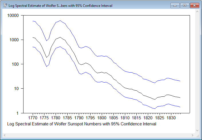 graph(footer="Log Spectral Estimate of Wolfer Sunspot Numbers with 95% Confidence Interval",log=10) 3