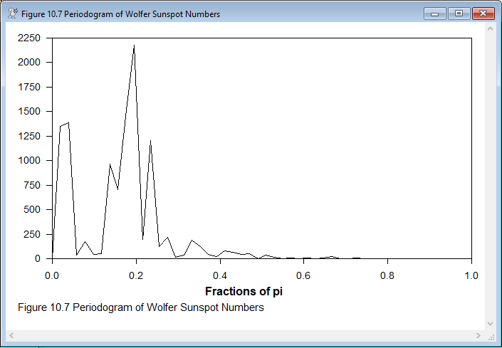 @spectrum(footer="Figure 10.7 Periodogram of Wolfer Sunspot Numbers",$