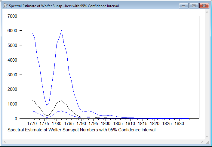 graph(footer="Spectral Estimate of Wolfer Sunspot Numbers with 95% Confidence Interval") 3